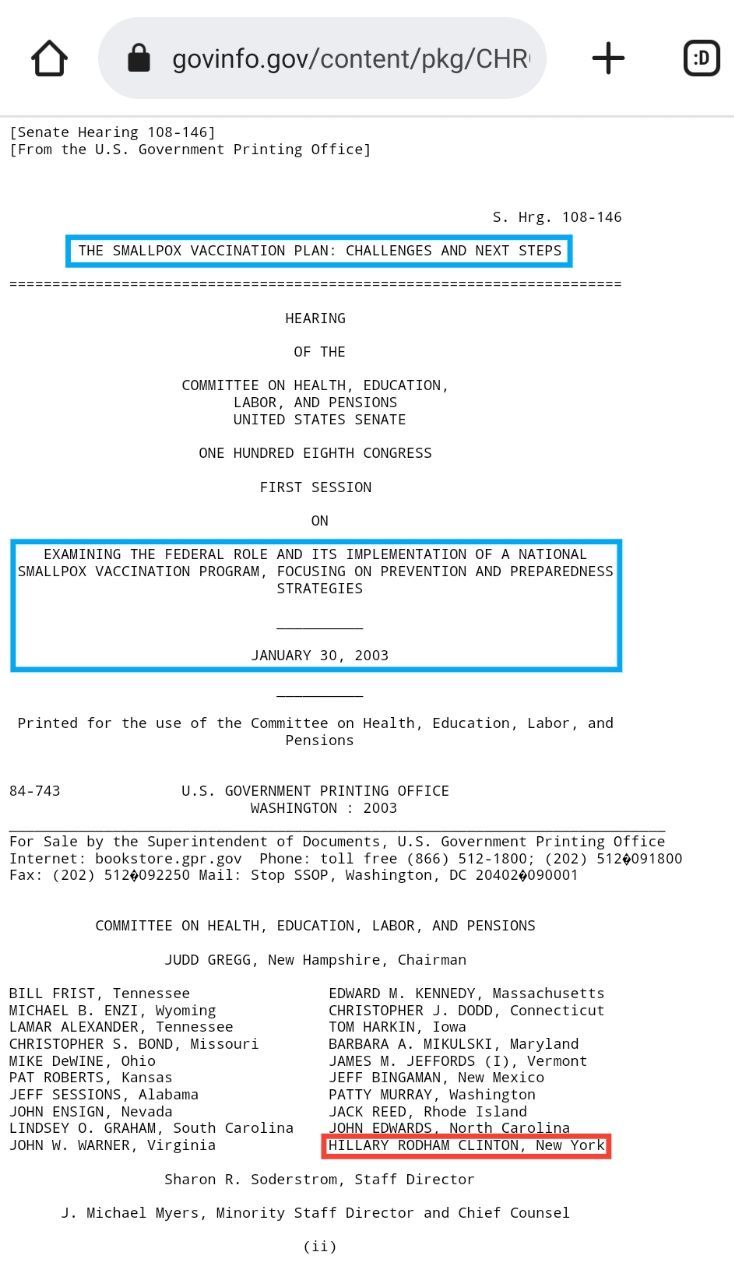 – Hillary Rodham Clinton + Piano di vaccinazione contro il vaiolo – 2003