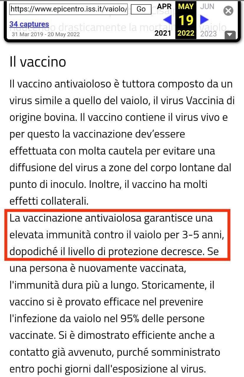 Fino al 19 maggio 2022 (https://web.archive.org/web/20220519095018/https://www.epicentro.iss.it/vaiolo/) (vedi immagini allegate), nella pagina dell’ISS dedicata al vaiolo, erano presenti le seguenti frasi: